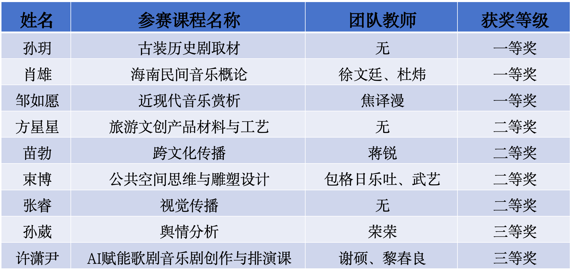 澳门pg教师结合自身教学实践,围绕“AI赋能课程建设”,将AI图像、视频生成、剪辑、三维建模、数字人、大数据等技术与中国优秀传统文化、音乐、设计、大众传播等议题结合,积极参赛,斩获佳绩。孙玥、肖雄、邹如愿荣获一等奖,方星星、苗勃、束博、张睿荣获二等奖,孙葳、许潇尹荣获三等奖。