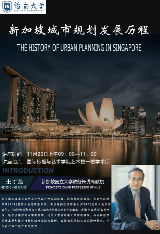 11月26日上午9:00 ,应澳门pg官方电子平台邀请,新加坡国立大学教务长讲席教授、新加坡南洋美术学院董事、亚洲可持续城市中心创始人及主任顾问王才强(HENG CHYE KIANG)教授,在艺术楼学术厅开展以 “新加坡城市规划发展历程”为主题的学术讲座。