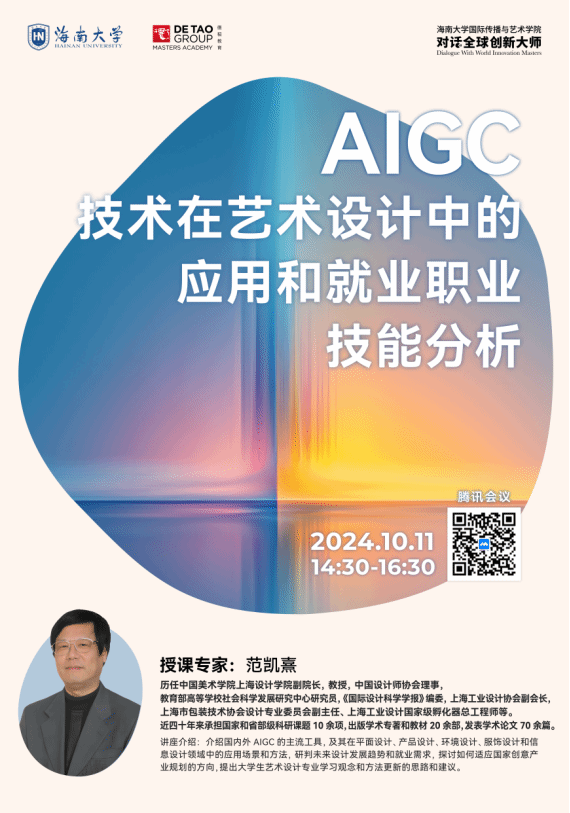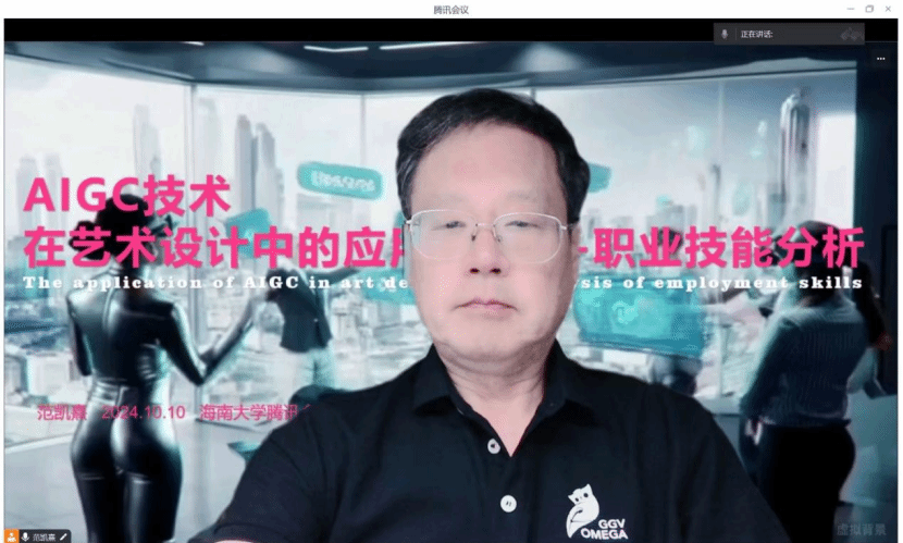 10月11日14:30,澳门pg官方电子平台2024“对话全球创新大师讲座”《AIGC技术在艺术设计中的应用和就业职业技能分析》在线上举行,由中国美术学院范凯熹教授主讲,设计系专业教师李珂博士担任学术主持,线上线下共100名左右师生同时参与。