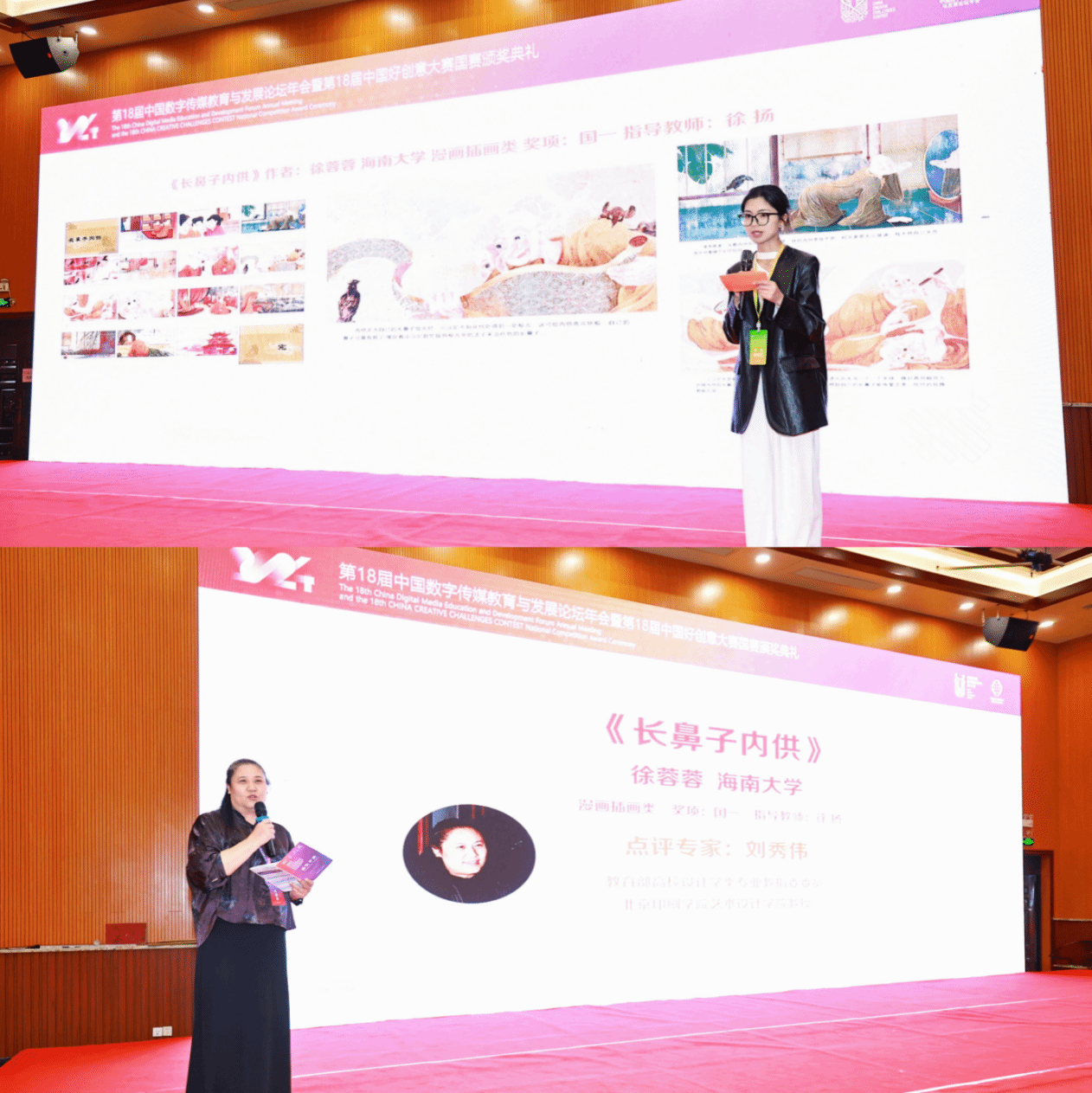 澳门pg学生徐蓉蓉荣获国赛一等奖,并作为获奖嘉宾邀请上台进行作品创作分享。教育部高校设计学专业教指委委员、北京印刷学院艺术设计学院教授刘秀伟现场点评认为:这部插画作品在艺术风格、主题表达、技术手法、情感传达以及文化内涵等多个方面都表现出色,是一次成功的艺术创作实践。