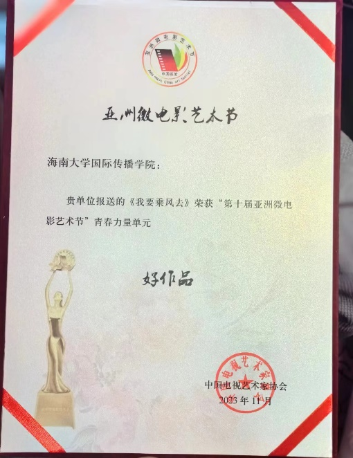 2023年11月24日至26日,第十届亚洲微电影艺术节在云南省临沧市举办,澳门pg官方电子平台国际传播学院2020级戏影专业学生团队凭借作品《我要乘风去》,获得了青春力量单元“好作品”奖,展现出扎实的专业素养和创作基础,也是澳门pg践行培养具有国际视野、创新思维和实践能力的优秀影视人才的体现。