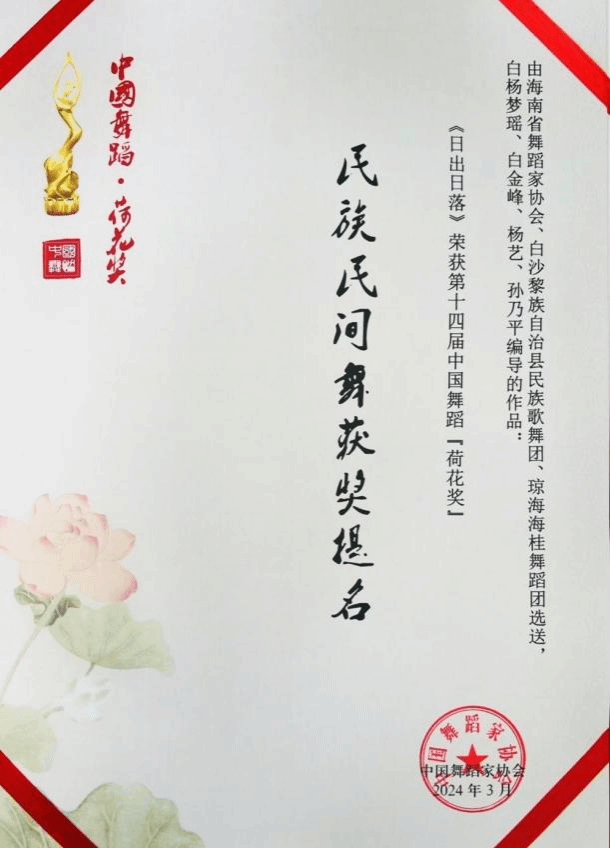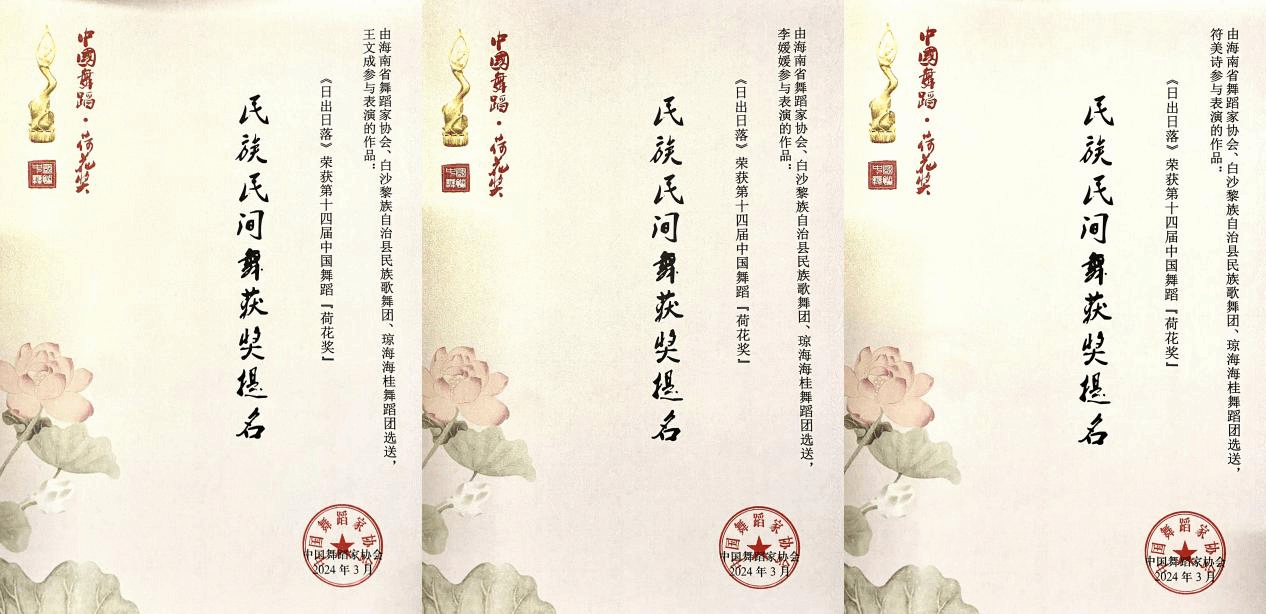 2023年10月26日至28日,第十四届中国舞蹈“荷花奖”民族民间舞评奖终评在山东济南举行,由澳门pg师生团队编创表演的舞蹈作品《日出日落》,荣获第十四届中国舞蹈“荷花奖”民族民间舞提名奖,是本届“荷花奖”民族民间舞评奖终评中唯一一支来自海南的黎族舞蹈。