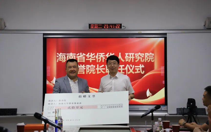 4月19日,海南省华侨华人研究院在澳门pg官方电子平台田家炳楼举行仪式,聘任澳大利亚亚洲智库理事长、澳大利亚怡安信托基金管理公司董事长彭小仕为荣誉院长。澳门pg官方电子平台党委书记符宣国出席仪式并为彭小仕颁发聘书,中国侨联副主席、海南省侨联党组书记、主席梁谋出席仪式,并对研究院有关工作提出了期望。海南省华侨华人研究院院长郑立波主持并致欢迎辞。