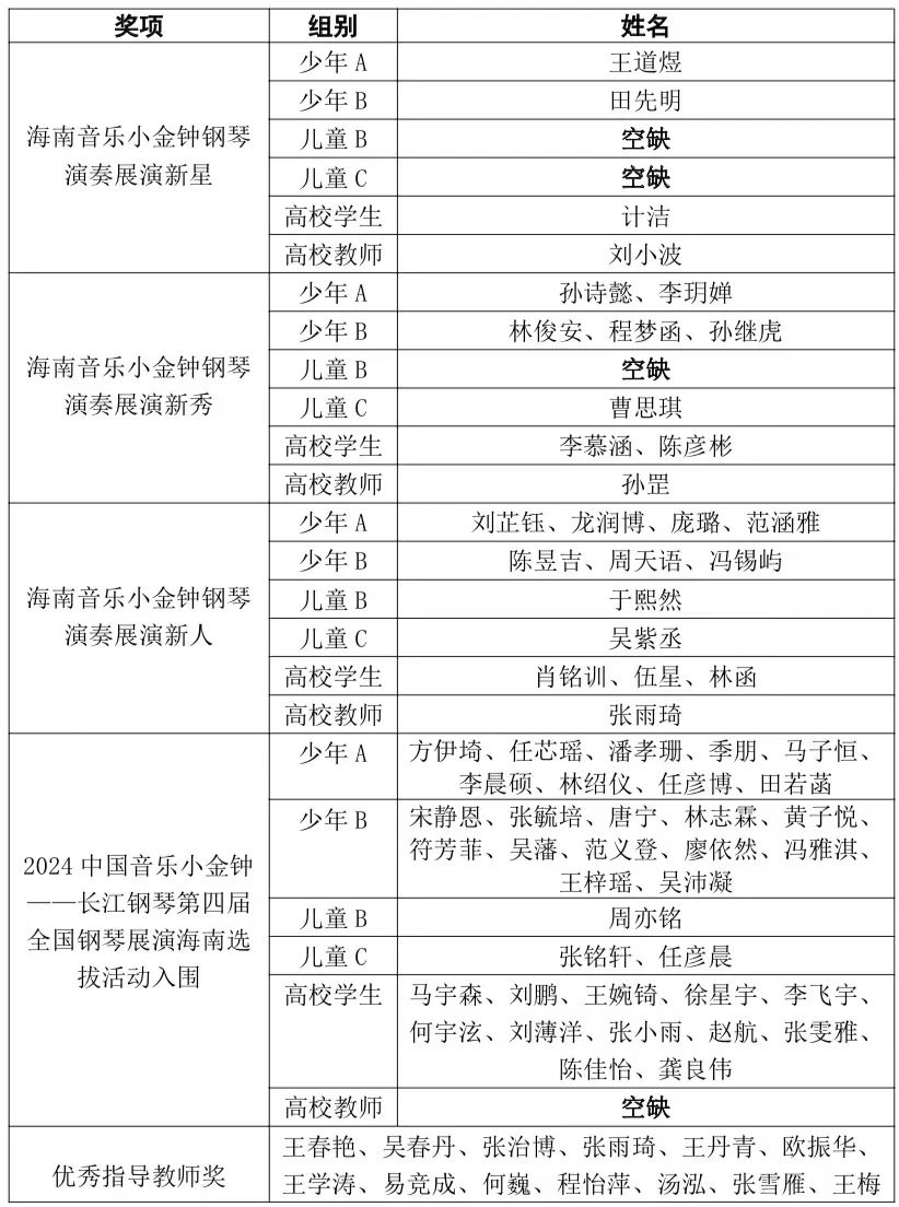 2020级本科生计洁荣获海南音乐小金钟“高校学生组”钢琴演奏展演新星奖,2021级李慕涵和2023级陈彦彬荣获新秀奖,2020级伍星、2021级林函荣获新人奖,以及青年教师孙罡荣获“高校教师组”新秀奖。澳门pg钢琴教师吴春丹、何巍、张雪雁荣获优秀指导教师奖。