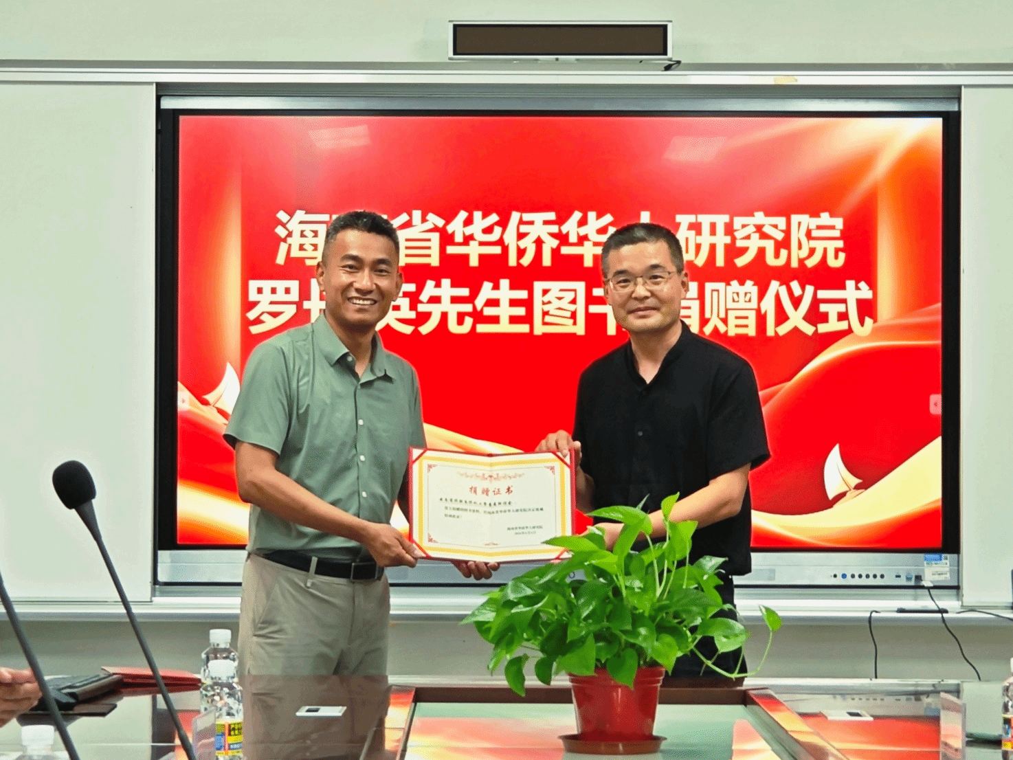 6月4日,海南省华侨华人研究院在田家炳楼举行罗长英先生图书捐赠仪式。研究院秘书长安华涛接受图书捐赠,并向罗长英先生、云南省侨联南侨机工暨眷属联谊会颁发了图书收藏证书。海口市侨联专职副主席苏先智、海口市南侨机工眷属联谊会会长罗长英、海口市南侨机工眷属联谊会理事陈良维、海口市南侨机工眷属联谊会理事罗章信、澳门pg官方电子平台海德书院党委书记韩胜丁出席活动,澳门pg官方电子平台副教授孔泽鸣主持仪式。
